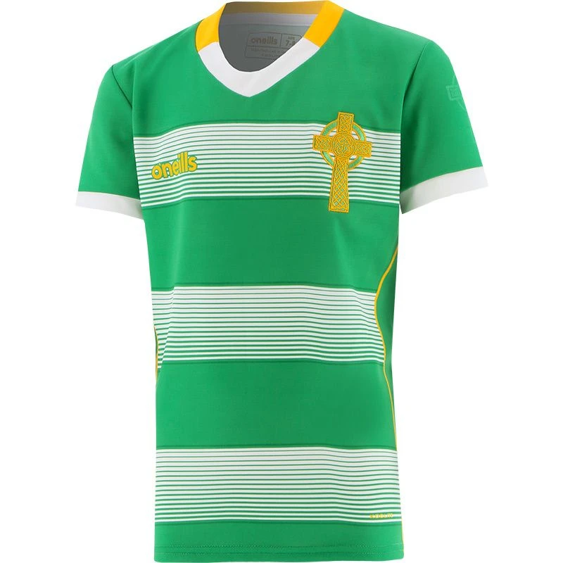 The Kids’ Celtic Cross jersey features a hooped design and embroidered Celtic Cross on the chest for the world to see. The back showcases a striking Celtic cross watermark design with the lettering ‘In Éirinn tá Neart’ – In Ireland There Is Strength. The jersey is made from high-performance fabric with catch, move and release nano-technology that transports moisture away from the skin to keep you cool. Show your Irish pride with the Celtic Cross hooped jersey!