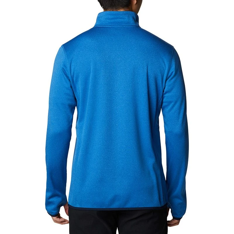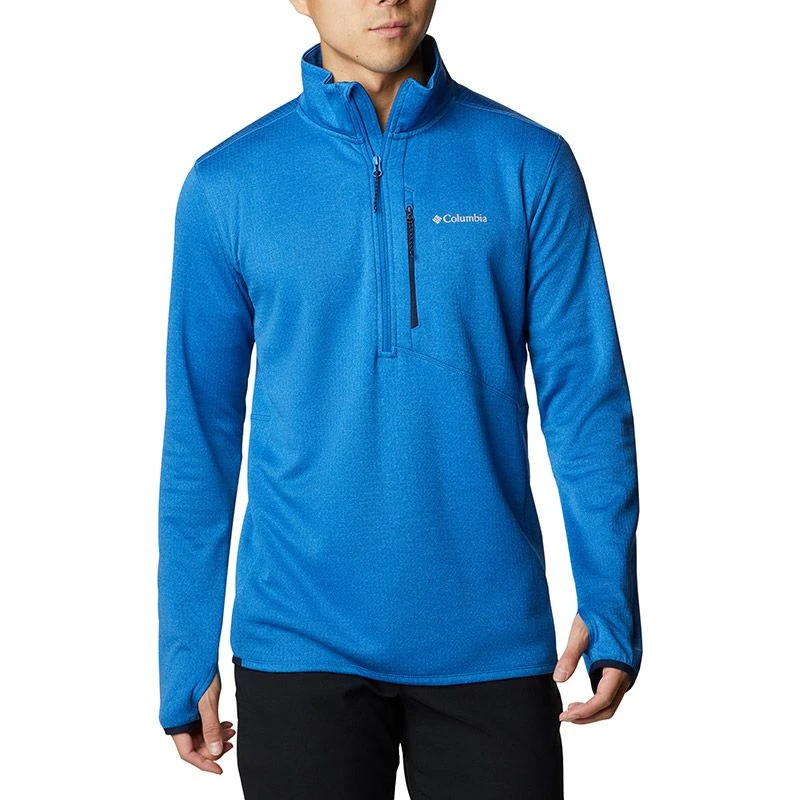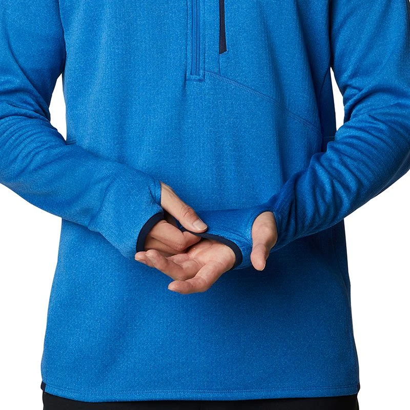 The half-zip silhouette features a chin guard and long sleeves finished with thumb holes for extra protection.