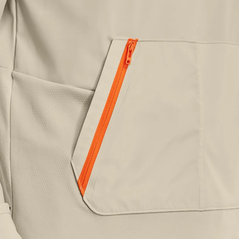 - Woven overlay on front kangaroo pocket with zip opening for secure storage